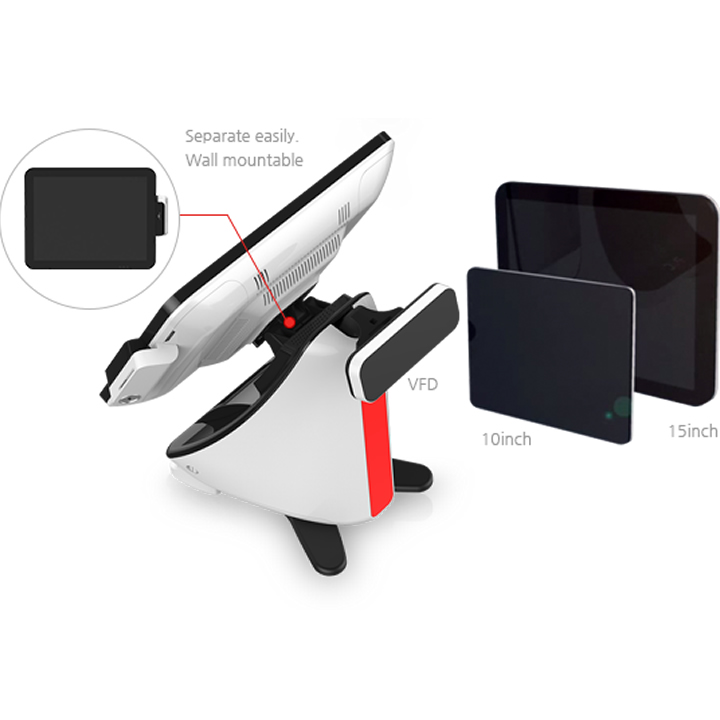 Detasarea rapida a ecranului de baza Sisteme diverse de afisare pentru clienti Afisaj tip VFD cu 2 linii si 20 caractere Ecran secundar de 10" sau 15" |